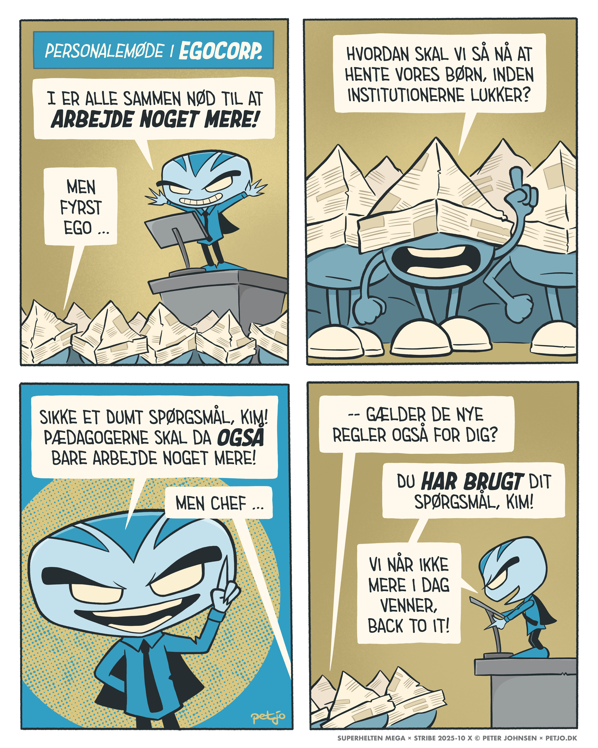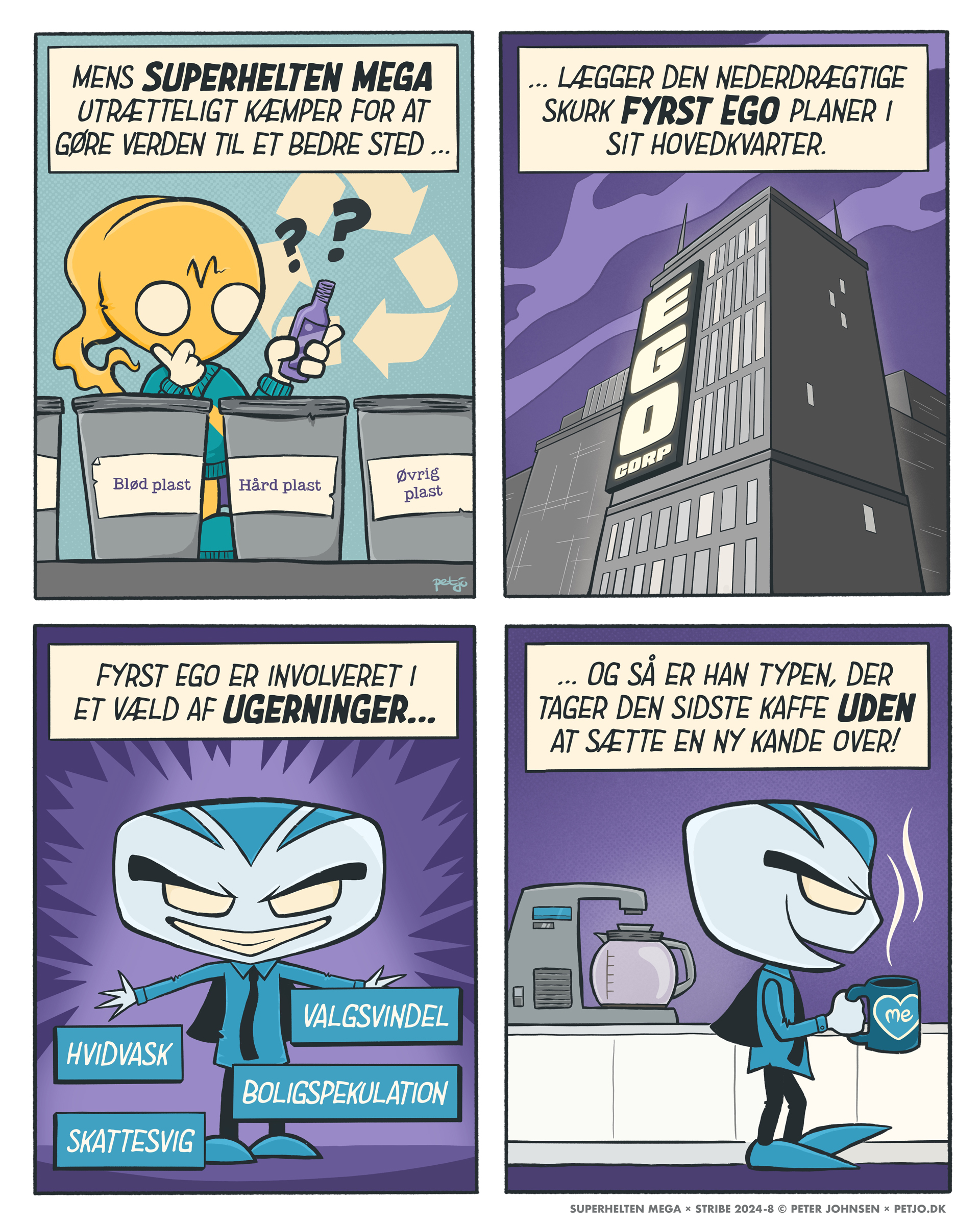 Her kommer de første 12 striber i serien om MEGA — i den rækkefølge de er tegnet og fortalt.